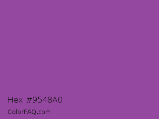 Hex #9548a0 Color is a normal magenta color and the nearest color is Purpureus #9a4eae. Hex code #9548a0 and RGB value is rgb(149,72,160). In RGB color space, this color is composed of 58% red, 28% green, 63% blue, In CMYK color space, this color is composed of 7% cyan, 55% magenta, 0% yellow , 37% black , In HSL color space, this color has a hue angle of 293° , 38% saturation and 45% lightness.