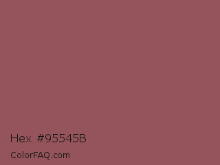 Hex #95545b Color is a normal red color and the nearest color is Rose Taupe #905d5d. Hex code #95545b and RGB value is rgb(149,84,91). In RGB color space, this color is composed of 58% red, 33% green, 36% blue, In CMYK color space, this color is composed of 0% cyan, 44% magenta, 39% yellow , 42% black , In HSL color space, this color has a hue angle of 354° , 28% saturation and 46% lightness.