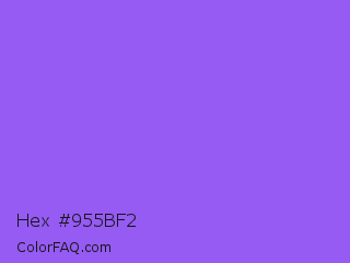 Hex #955bf2 Color is a light violet color and the nearest color is Navy Purple #9457eb. Hex code #955bf2 and RGB value is rgb(149,91,242). In RGB color space, this color is composed of 58% red, 36% green, 95% blue, In CMYK color space, this color is composed of 38% cyan, 62% magenta, 0% yellow , 5% black , In HSL color space, this color has a hue angle of 263° , 85% saturation and 65% lightness.