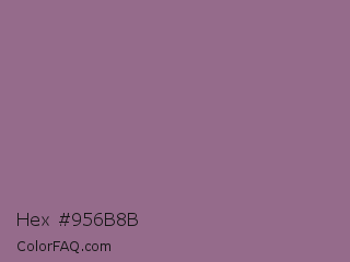 Hex #956b8b Color is a normal magenta color and the nearest color is Strikemaster #956387. Hex code #956b8b and RGB value is rgb(149,107,139). In RGB color space, this color is composed of 58% red, 42% green, 55% blue, In CMYK color space, this color is composed of 0% cyan, 28% magenta, 7% yellow , 42% black , In HSL color space, this color has a hue angle of 314° , 17% saturation and 50% lightness.