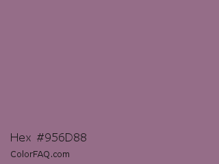 Hex #956d88 Color is a normal magenta color and the nearest color is Strikemaster #956387. Hex code #956d88 and RGB value is rgb(149,109,136). In RGB color space, this color is composed of 58% red, 43% green, 53% blue, In CMYK color space, this color is composed of 0% cyan, 27% magenta, 9% yellow , 42% black , In HSL color space, this color has a hue angle of 320° , 16% saturation and 51% lightness.