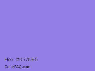 Hex #957de6 Color is a light indigo color and the nearest color is Medium Purple #9370db. Hex code #957de6 and RGB value is rgb(149,125,230). In RGB color space, this color is composed of 58% red, 49% green, 90% blue, In CMYK color space, this color is composed of 35% cyan, 46% magenta, 0% yellow , 10% black , In HSL color space, this color has a hue angle of 254° , 68% saturation and 70% lightness.