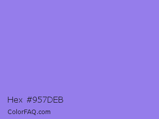 Hex #957deb Color is a light indigo color and the nearest color is Medium Purple #9370db. Hex code #957deb and RGB value is rgb(149,125,235). In RGB color space, this color is composed of 58% red, 49% green, 92% blue, In CMYK color space, this color is composed of 37% cyan, 47% magenta, 0% yellow , 8% black , In HSL color space, this color has a hue angle of 253° , 73% saturation and 71% lightness.