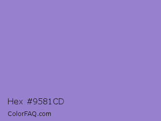 Hex #9581cd Color is a light indigo color and the nearest color is Lilac Bush #9874d3. Hex code #9581cd and RGB value is rgb(149,129,205). In RGB color space, this color is composed of 58% red, 51% green, 80% blue, In CMYK color space, this color is composed of 27% cyan, 37% magenta, 0% yellow , 20% black , In HSL color space, this color has a hue angle of 256° , 43% saturation and 65% lightness.