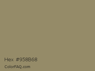 Hex #958b68 Color is a normal yellow color and the nearest color is Arrowtown #948771. Hex code #958b68 and RGB value is rgb(149,139,104). In RGB color space, this color is composed of 58% red, 55% green, 41% blue, In CMYK color space, this color is composed of 0% cyan, 7% magenta, 30% yellow , 42% black , In HSL color space, this color has a hue angle of 47° , 18% saturation and 50% lightness.