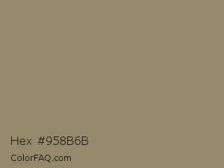 Hex #958b6b Color is a normal yellow color and the nearest color is Arrowtown #948771. Hex code #958b6b and RGB value is rgb(149,139,107). In RGB color space, this color is composed of 58% red, 55% green, 42% blue, In CMYK color space, this color is composed of 0% cyan, 7% magenta, 28% yellow , 42% black , In HSL color space, this color has a hue angle of 46° , 17% saturation and 50% lightness.