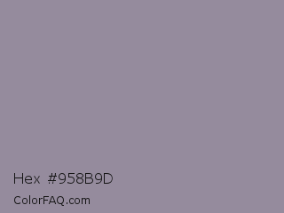 Hex #958b9d Color is a normal purple color and the nearest color is Manatee Crayola #8d90a1. Hex code #958b9d and RGB value is rgb(149,139,157). In RGB color space, this color is composed of 58% red, 55% green, 62% blue, In CMYK color space, this color is composed of 5% cyan, 11% magenta, 0% yellow , 38% black , In HSL color space, this color has a hue angle of 273° , 8% saturation and 58% lightness.