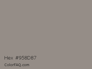 Hex #958d87 Color is a normal orange color and the nearest color is Stack #8a8f8a. Hex code #958d87 and RGB value is rgb(149,141,135). In RGB color space, this color is composed of 58% red, 55% green, 53% blue, In CMYK color space, this color is composed of 0% cyan, 5% magenta, 9% yellow , 42% black , In HSL color space, this color has a hue angle of 26° , 6% saturation and 56% lightness.