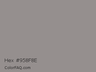 Hex #958f8e Color is a normal red color and the nearest color is Mountain Mist #959396. Hex code #958f8e and RGB value is rgb(149,143,142). In RGB color space, this color is composed of 58% red, 56% green, 56% blue, In CMYK color space, this color is composed of 0% cyan, 4% magenta, 5% yellow , 42% black , In HSL color space, this color has a hue angle of 9° , 3% saturation and 57% lightness.