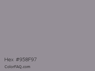 Hex #958f97 Color is a normal purple color and the nearest color is Mountain Mist #959396. Hex code #958f97 and RGB value is rgb(149,143,151). In RGB color space, this color is composed of 58% red, 56% green, 59% blue, In CMYK color space, this color is composed of 1% cyan, 5% magenta, 0% yellow , 41% black , In HSL color space, this color has a hue angle of 285° , 4% saturation and 58% lightness.