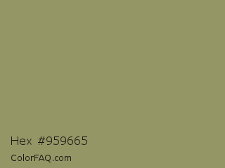 Hex #959665 Color is a normal yellow color and the nearest color is Moss Green #8a9a5b. Hex code #959665 and RGB value is rgb(149,150,101). In RGB color space, this color is composed of 58% red, 59% green, 40% blue, In CMYK color space, this color is composed of 1% cyan, 0% magenta, 33% yellow , 41% black , In HSL color space, this color has a hue angle of 61° , 20% saturation and 49% lightness.