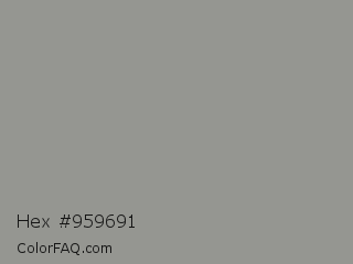 Hex #959691 Color is a normal lime color and the nearest color is Mountain Mist #959396. Hex code #959691 and RGB value is rgb(149,150,145). In RGB color space, this color is composed of 58% red, 59% green, 57% blue, In CMYK color space, this color is composed of 1% cyan, 0% magenta, 3% yellow , 41% black , In HSL color space, this color has a hue angle of 72° , 2% saturation and 58% lightness.