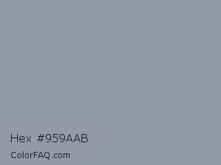Hex #959aab Color is a light blue color and the nearest color is Manatee #979aaa. Hex code #959aab and RGB value is rgb(149,154,171). In RGB color space, this color is composed of 58% red, 60% green, 67% blue, In CMYK color space, this color is composed of 13% cyan, 10% magenta, 0% yellow , 33% black , In HSL color space, this color has a hue angle of 226° , 12% saturation and 63% lightness.