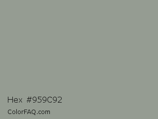 Hex #959c92 Color is a normal green color and the nearest color is Lemon Grass #9b9e8f. Hex code #959c92 and RGB value is rgb(149,156,146). In RGB color space, this color is composed of 58% red, 61% green, 57% blue, In CMYK color space, this color is composed of 4% cyan, 0% magenta, 6% yellow , 39% black , In HSL color space, this color has a hue angle of 102° , 5% saturation and 59% lightness.