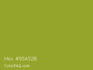 Hex #95a52b Color is a normal yellow color and the nearest color is Citron #9fa91f. Hex code #95a52b and RGB value is rgb(149,165,43). In RGB color space, this color is composed of 58% red, 65% green, 17% blue, In CMYK color space, this color is composed of 10% cyan, 0% magenta, 74% yellow , 35% black , In HSL color space, this color has a hue angle of 68° , 59% saturation and 41% lightness.