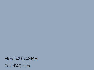 Hex #95a8be Color is a light blue color and the nearest color is Nepal #8eabc1. Hex code #95a8be and RGB value is rgb(149,168,190). In RGB color space, this color is composed of 58% red, 66% green, 75% blue, In CMYK color space, this color is composed of 22% cyan, 12% magenta, 0% yellow , 25% black , In HSL color space, this color has a hue angle of 212° , 24% saturation and 66% lightness.