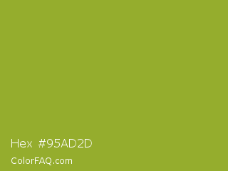 Hex #95ad2d Color is a normal lime color and the nearest color is Citron #9fa91f. Hex code #95ad2d and RGB value is rgb(149,173,45). In RGB color space, this color is composed of 58% red, 68% green, 18% blue, In CMYK color space, this color is composed of 14% cyan, 0% magenta, 74% yellow , 32% black , In HSL color space, this color has a hue angle of 71° , 59% saturation and 43% lightness.