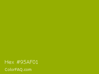 Hex #95af01 Color is a normal yellow color and the nearest color is Apple Green #8db600. Hex code #95af01 and RGB value is rgb(149,175,1). In RGB color space, this color is composed of 58% red, 69% green, 0% blue, In CMYK color space, this color is composed of 15% cyan, 0% magenta, 99% yellow , 31% black , In HSL color space, this color has a hue angle of 69° , 99% saturation and 35% lightness.