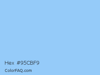 Hex #95cbf9 Color is a light blue color and the nearest color is Light Sky Blue #87cefa. Hex code #95cbf9 and RGB value is rgb(149,203,249). In RGB color space, this color is composed of 58% red, 80% green, 98% blue, In CMYK color space, this color is composed of 40% cyan, 18% magenta, 0% yellow , 2% black , In HSL color space, this color has a hue angle of 208° , 89% saturation and 78% lightness.