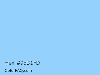 Hex #95d1fd Color is a light blue color and the nearest color is Light Sky Blue #87cefa. Hex code #95d1fd and RGB value is rgb(149,209,253). In RGB color space, this color is composed of 58% red, 82% green, 99% blue, In CMYK color space, this color is composed of 41% cyan, 17% magenta, 0% yellow , 1% black , In HSL color space, this color has a hue angle of 205° , 96% saturation and 79% lightness.