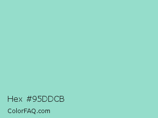 Hex #95ddcb Color is a light cyan color and the nearest color is Pale Robin Egg Blue #96ded1. Hex code #95ddcb and RGB value is rgb(149,221,203). In RGB color space, this color is composed of 58% red, 87% green, 80% blue, In CMYK color space, this color is composed of 33% cyan, 0% magenta, 8% yellow , 13% black , In HSL color space, this color has a hue angle of 165° , 51% saturation and 73% lightness.