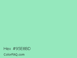 Hex #95e8bd Color is a light green color and the nearest color is Algae Green #93dfb8. Hex code #95e8bd and RGB value is rgb(149,232,189). In RGB color space, this color is composed of 58% red, 91% green, 74% blue, In CMYK color space, this color is composed of 36% cyan, 0% magenta, 19% yellow , 9% black , In HSL color space, this color has a hue angle of 149° , 64% saturation and 75% lightness.