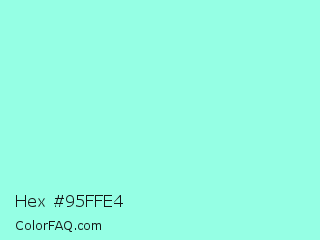 Hex #95ffe4 Color is a light cyan color and the nearest color is Water Leaf #a1e9de. Hex code #95ffe4 and RGB value is rgb(149,255,228). In RGB color space, this color is composed of 58% red, 100% green, 89% blue, In CMYK color space, this color is composed of 42% cyan, 0% magenta, 11% yellow , 0% black , In HSL color space, this color has a hue angle of 165° , 100% saturation and 79% lightness.