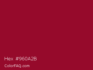 Hex #960a2b Color is a normal red color and the nearest color is Paprika #8d0226. Hex code #960a2b and RGB value is rgb(150,10,43). In RGB color space, this color is composed of 59% red, 4% green, 17% blue, In CMYK color space, this color is composed of 0% cyan, 93% magenta, 71% yellow , 41% black , In HSL color space, this color has a hue angle of 346° , 88% saturation and 31% lightness.