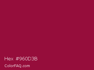 Hex #960d3b Color is a normal rose color and the nearest color is Pink Raspberry #980036. Hex code #960d3b and RGB value is rgb(150,13,59). In RGB color space, this color is composed of 59% red, 5% green, 23% blue, In CMYK color space, this color is composed of 0% cyan, 91% magenta, 61% yellow , 41% black , In HSL color space, this color has a hue angle of 340° , 84% saturation and 32% lightness.