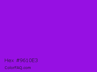 Hex #9610e3 Color is a normal purple color and the nearest color is Dark Violet #9400d3. Hex code #9610e3 and RGB value is rgb(150,16,227). In RGB color space, this color is composed of 59% red, 6% green, 89% blue, In CMYK color space, this color is composed of 34% cyan, 93% magenta, 0% yellow , 11% black , In HSL color space, this color has a hue angle of 278° , 87% saturation and 48% lightness.