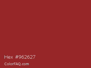 Hex #962627 Color is a normal red color and the nearest color is Vivid Auburn #922724. Hex code #962627 and RGB value is rgb(150,38,39). In RGB color space, this color is composed of 59% red, 15% green, 15% blue, In CMYK color space, this color is composed of 0% cyan, 75% magenta, 74% yellow , 41% black , In HSL color space, this color has a hue angle of 359° , 60% saturation and 37% lightness.