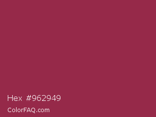 Hex #962949 Color is a normal rose color and the nearest color is Big Dip O Ruby #9c2542. Hex code #962949 and RGB value is rgb(150,41,73). In RGB color space, this color is composed of 59% red, 16% green, 29% blue, In CMYK color space, this color is composed of 0% cyan, 73% magenta, 51% yellow , 41% black , In HSL color space, this color has a hue angle of 342° , 57% saturation and 37% lightness.
