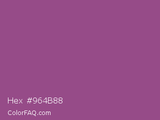 Hex #964b88 Color is a normal magenta color and the nearest color is Razzmic Berry #8d4e85. Hex code #964b88 and RGB value is rgb(150,75,136). In RGB color space, this color is composed of 59% red, 29% green, 53% blue, In CMYK color space, this color is composed of 0% cyan, 50% magenta, 9% yellow , 41% black , In HSL color space, this color has a hue angle of 311° , 33% saturation and 44% lightness.