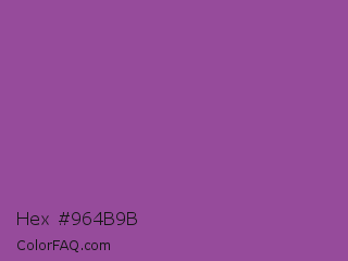 Hex #964b9b Color is a normal magenta color and the nearest color is Purpureus #9a4eae. Hex code #964b9b and RGB value is rgb(150,75,155). In RGB color space, this color is composed of 59% red, 29% green, 61% blue, In CMYK color space, this color is composed of 3% cyan, 52% magenta, 0% yellow , 39% black , In HSL color space, this color has a hue angle of 296° , 35% saturation and 45% lightness.