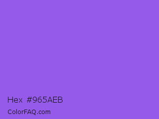 Hex #965aeb Color is a light violet color and the nearest color is Navy Purple #9457eb. Hex code #965aeb and RGB value is rgb(150,90,235). In RGB color space, this color is composed of 59% red, 35% green, 92% blue, In CMYK color space, this color is composed of 36% cyan, 62% magenta, 0% yellow , 8% black , In HSL color space, this color has a hue angle of 265° , 78% saturation and 64% lightness.