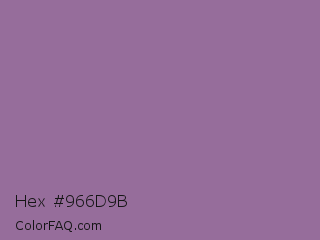Hex #966d9b Color is a normal magenta color and the nearest color is Trendy Pink #8c6495. Hex code #966d9b and RGB value is rgb(150,109,155). In RGB color space, this color is composed of 59% red, 43% green, 61% blue, In CMYK color space, this color is composed of 3% cyan, 30% magenta, 0% yellow , 39% black , In HSL color space, this color has a hue angle of 293° , 19% saturation and 52% lightness.