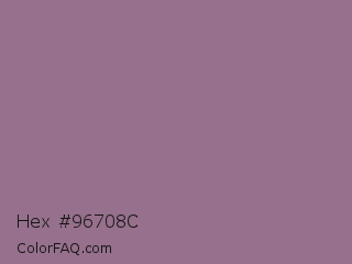 Hex #96708c Color is a normal magenta color and the nearest color is Mountbatten Pink #997a8d. Hex code #96708c and RGB value is rgb(150,112,140). In RGB color space, this color is composed of 59% red, 44% green, 55% blue, In CMYK color space, this color is composed of 0% cyan, 25% magenta, 7% yellow , 41% black , In HSL color space, this color has a hue angle of 316° , 15% saturation and 51% lightness.