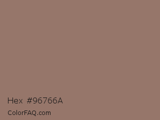 Hex #96766a Color is a normal orange color and the nearest color is Almond Frost #907b71. Hex code #96766a and RGB value is rgb(150,118,106). In RGB color space, this color is composed of 59% red, 46% green, 42% blue, In CMYK color space, this color is composed of 0% cyan, 21% magenta, 29% yellow , 41% black , In HSL color space, this color has a hue angle of 16° , 17% saturation and 50% lightness.