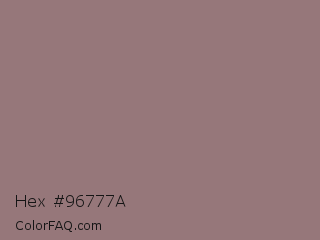 Hex #96777a Color is a normal red color and the nearest color is Bazaar #98777b. Hex code #96777a and RGB value is rgb(150,119,122). In RGB color space, this color is composed of 59% red, 47% green, 48% blue, In CMYK color space, this color is composed of 0% cyan, 21% magenta, 19% yellow , 41% black , In HSL color space, this color has a hue angle of 354° , 13% saturation and 53% lightness.