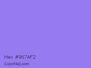 Hex #967af2 Color is a light indigo color and the nearest color is Medium Purple #9370db. Hex code #967af2 and RGB value is rgb(150,122,242). In RGB color space, this color is composed of 59% red, 48% green, 95% blue, In CMYK color space, this color is composed of 38% cyan, 50% magenta, 0% yellow , 5% black , In HSL color space, this color has a hue angle of 254° , 82% saturation and 71% lightness.