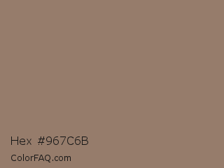 Hex #967c6b Color is a normal orange color and the nearest color is Almond Frost #907b71. Hex code #967c6b and RGB value is rgb(150,124,107). In RGB color space, this color is composed of 59% red, 49% green, 42% blue, In CMYK color space, this color is composed of 0% cyan, 17% magenta, 29% yellow , 41% black , In HSL color space, this color has a hue angle of 24° , 17% saturation and 50% lightness.