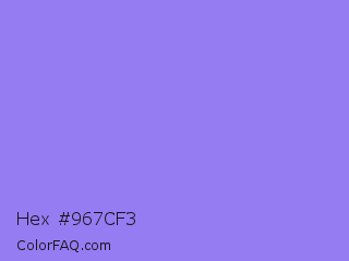 Hex #967cf3 Color is a light indigo color and the nearest color is Medium Purple #9370db. Hex code #967cf3 and RGB value is rgb(150,124,243). In RGB color space, this color is composed of 59% red, 49% green, 95% blue, In CMYK color space, this color is composed of 38% cyan, 49% magenta, 0% yellow , 5% black , In HSL color space, this color has a hue angle of 253° , 83% saturation and 72% lightness.