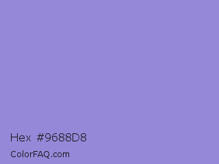 Hex #9688d8 Color is a light indigo color and the nearest color is Chetwode Blue #8581d9. Hex code #9688d8 and RGB value is rgb(150,136,216). In RGB color space, this color is composed of 59% red, 53% green, 85% blue, In CMYK color space, this color is composed of 31% cyan, 37% magenta, 0% yellow , 15% black , In HSL color space, this color has a hue angle of 251° , 51% saturation and 69% lightness.