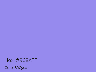 Hex #968aee Color is a light indigo color and the nearest color is Portage #8b9fee. Hex code #968aee and RGB value is rgb(150,138,238). In RGB color space, this color is composed of 59% red, 54% green, 93% blue, In CMYK color space, this color is composed of 37% cyan, 42% magenta, 0% yellow , 7% black , In HSL color space, this color has a hue angle of 247° , 75% saturation and 74% lightness.