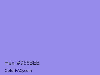 Hex #968beb Color is a light indigo color and the nearest color is Portage #8b9fee. Hex code #968beb and RGB value is rgb(150,139,235). In RGB color space, this color is composed of 59% red, 55% green, 92% blue, In CMYK color space, this color is composed of 36% cyan, 41% magenta, 0% yellow , 8% black , In HSL color space, this color has a hue angle of 247° , 71% saturation and 73% lightness.