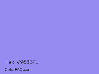Hex #968bf1 Color is a light indigo color and the nearest color is Portage #8b9fee. Hex code #968bf1 and RGB value is rgb(150,139,241). In RGB color space, this color is composed of 59% red, 55% green, 95% blue, In CMYK color space, this color is composed of 38% cyan, 42% magenta, 0% yellow , 5% black , In HSL color space, this color has a hue angle of 246° , 78% saturation and 75% lightness.