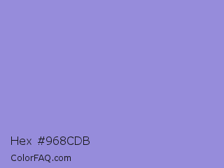 Hex #968cdb Color is a light indigo color and the nearest color is Blue Bell Crayola #9999cc. Hex code #968cdb and RGB value is rgb(150,140,219). In RGB color space, this color is composed of 59% red, 55% green, 86% blue, In CMYK color space, this color is composed of 32% cyan, 36% magenta, 0% yellow , 14% black , In HSL color space, this color has a hue angle of 248° , 52% saturation and 70% lightness.