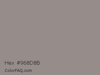 Hex #968d8b Color is a normal red color and the nearest color is Venus #928590. Hex code #968d8b and RGB value is rgb(150,141,139). In RGB color space, this color is composed of 59% red, 55% green, 55% blue, In CMYK color space, this color is composed of 0% cyan, 6% magenta, 7% yellow , 41% black , In HSL color space, this color has a hue angle of 11° , 5% saturation and 57% lightness.