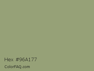Hex #96a177 Color is a normal lime color and the nearest color is Artichoke #8f9779. Hex code #96a177 and RGB value is rgb(150,161,119). In RGB color space, this color is composed of 59% red, 63% green, 47% blue, In CMYK color space, this color is composed of 7% cyan, 0% magenta, 26% yellow , 37% black , In HSL color space, this color has a hue angle of 76° , 18% saturation and 55% lightness.