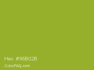 Hex #96b02b Color is a normal lime color and the nearest color is Citron #9fa91f. Hex code #96b02b and RGB value is rgb(150,176,43). In RGB color space, this color is composed of 59% red, 69% green, 17% blue, In CMYK color space, this color is composed of 15% cyan, 0% magenta, 76% yellow , 31% black , In HSL color space, this color has a hue angle of 72° , 61% saturation and 43% lightness.
